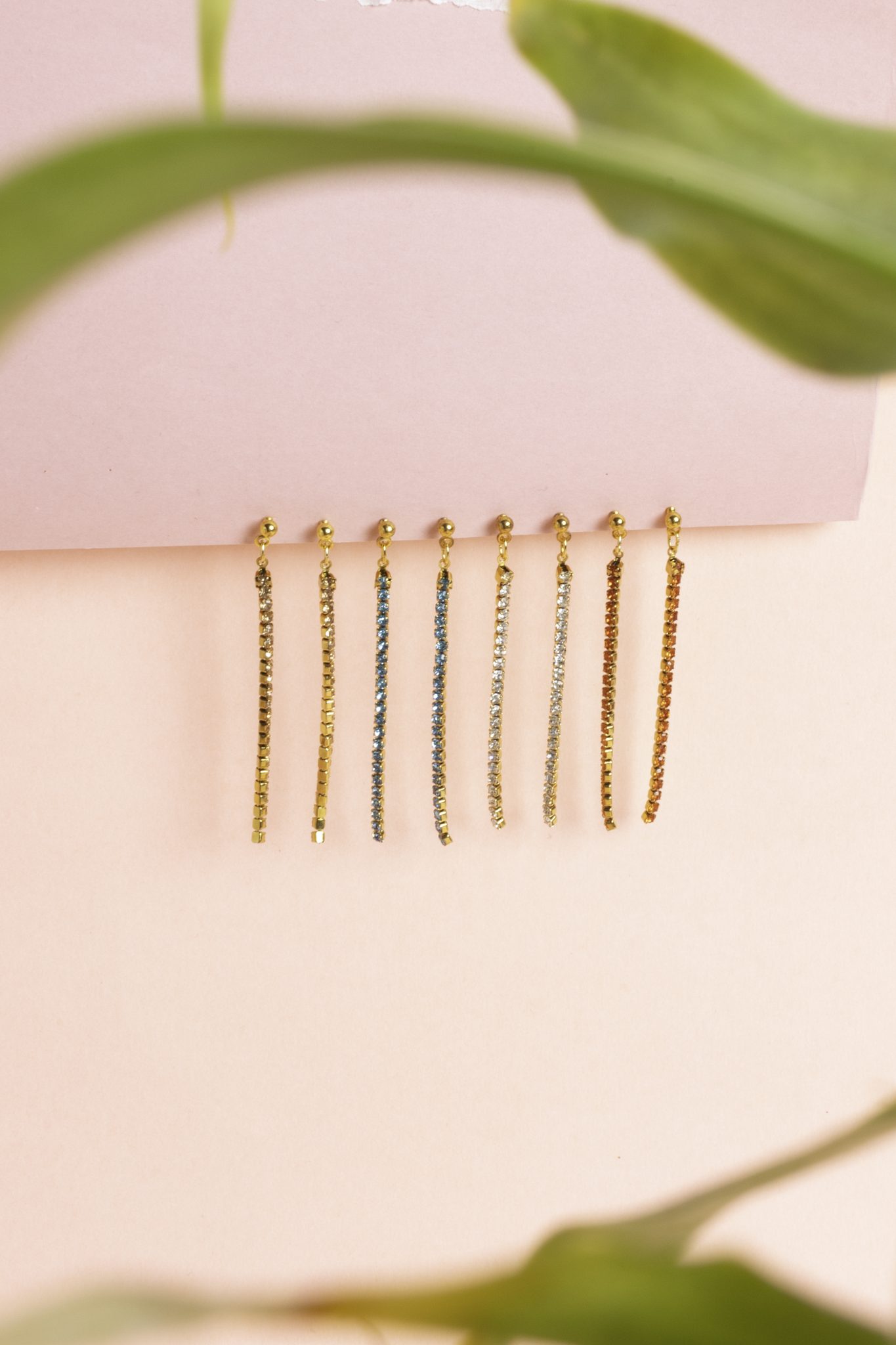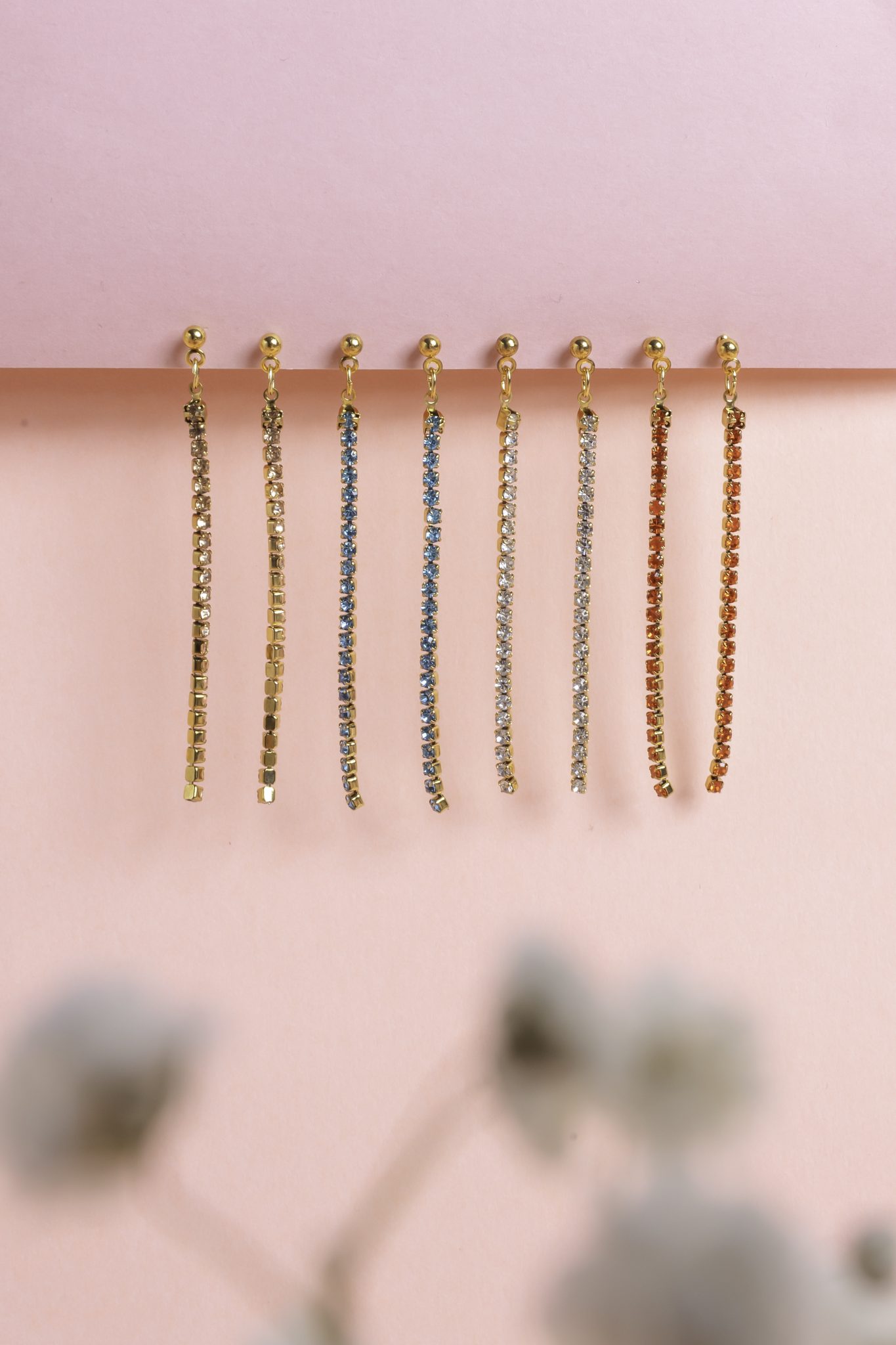 Pendientes colgantes con cristales de colores, disponibles en champán, cristal, azul y naranja. Cierre de presión para mayor sujeción.